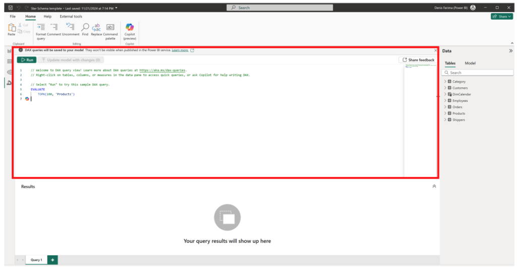 Editorul de interogări DAX – unde utilizatorii creează și editează interogările.
