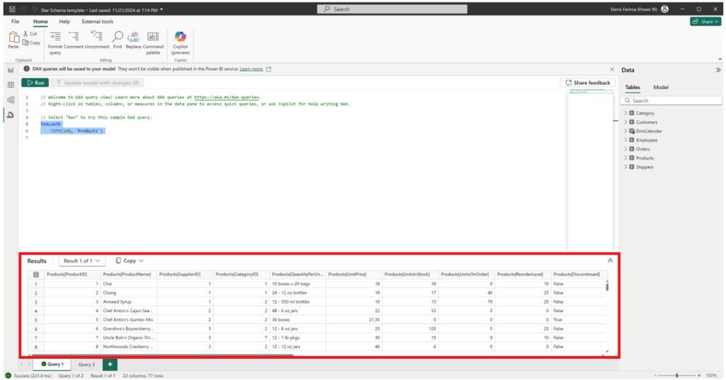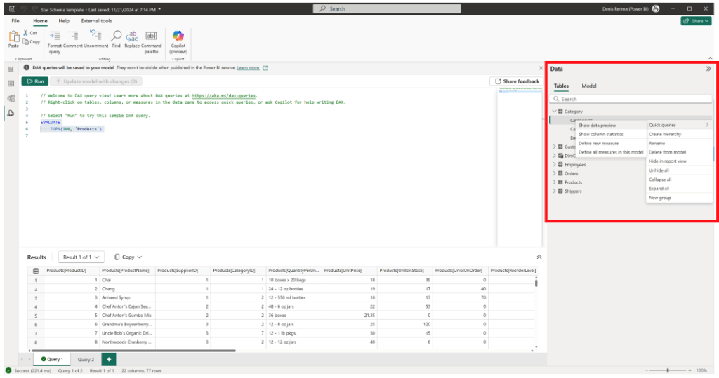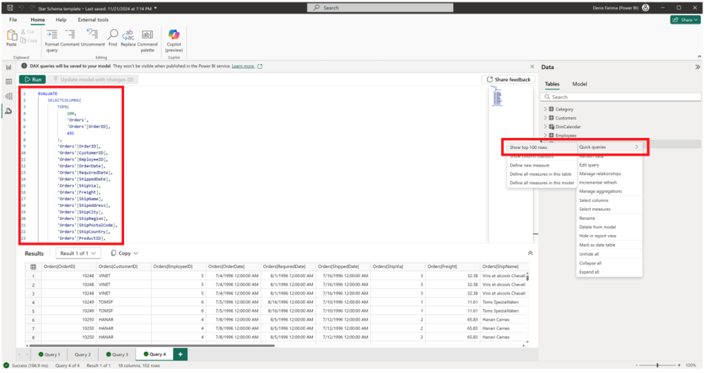 Puteți utiliza opțiunea Quick Queries pentru sarcini comune. De exemplu, selectarea opțiunii Show top 1,000 rows generează și rulează automat interogarea. Aceasta este o funcție excelentă pentru a inspecta rapid datele fără a scrie manual cod DAX.