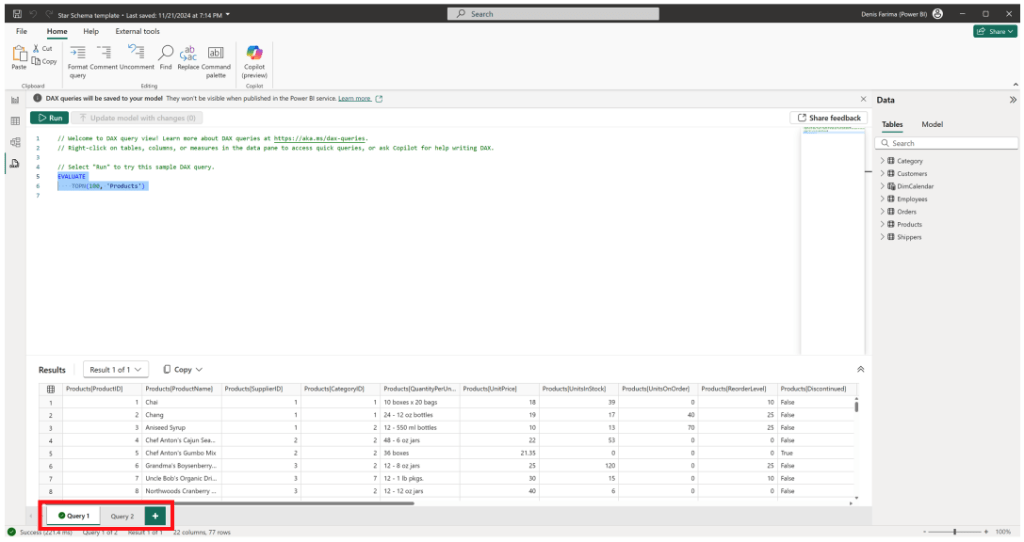 La fel ca în cazul rapoartelor Power BI, puteți gestiona mai multe interogări în vizualizarea interogărilor DAX. Fiecare interogare poate fi salvată în fișierul de raport, permițându-vă să lucrați la diferite analize și să reluați activitatea de unde ați rămas.