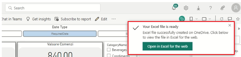 Pentru a utiliza „Analyze in Excel”, creatorul raportului trebuie să aibă permisiunea Build pentru setul de date.
