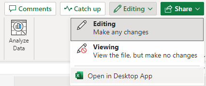 Dacă vrei să lucrezi cu datele în aplicația Excel Desktop, selectează butonul Editing din panglică, apoi alege Open in Desktop app.