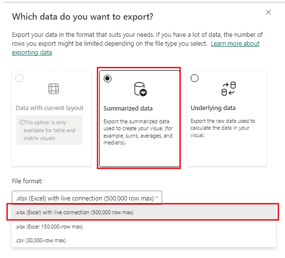 În meniul de export, atunci când selectezi „Summarized data”, vei avea acces la opțiunea „Excel with live connection”.
