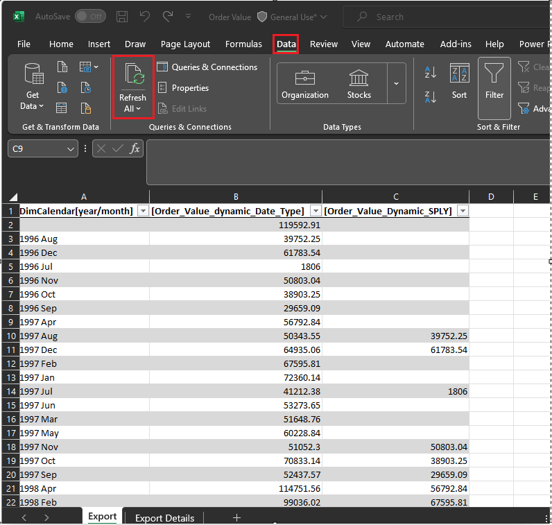 Deoarece datele rămân active (live), pentru exporturile ulterioare, utilizatorii trebuie doar să apese butonul Refresh All, asigurând astfel preluarea automată a celor mai recente date din raportul Power BI.