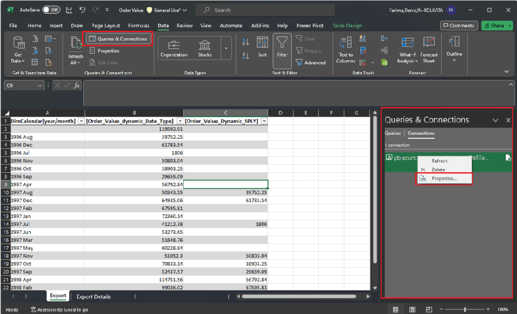 Pentru gestionarea și configurarea setărilor legate de conexiunea live, poți accesa butonul Queries & Connections, iar în panoul nou afișat, dai clic dreapta pe conexiunea de interes și selectezi Properties.