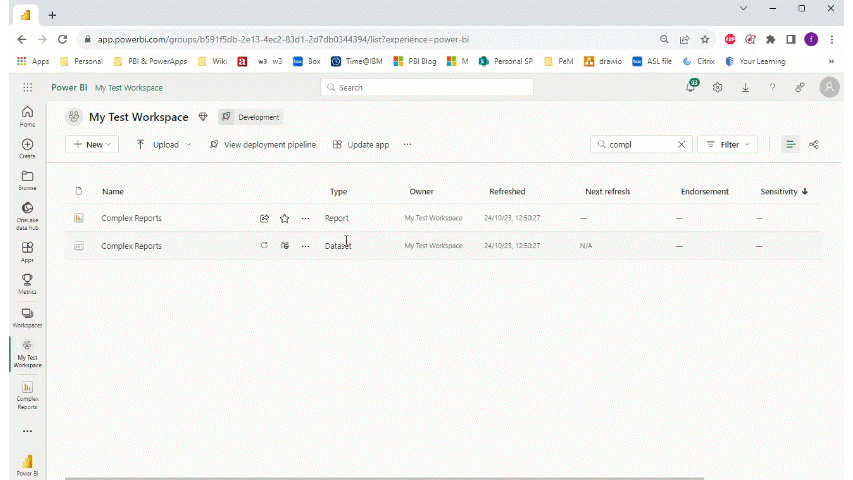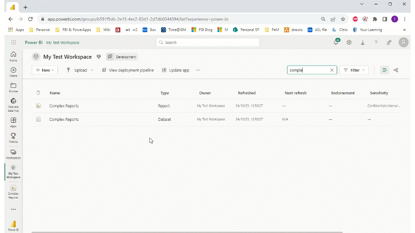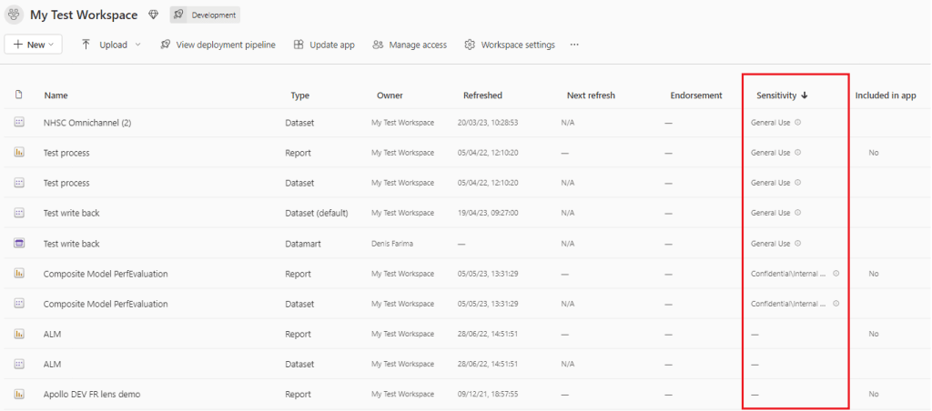 Etichetele de sensibilitate apar în coloana Sensitivity din vizualizarea de listă pentru dashboard-uri, rapoarte, modele semantice și dataflow-uri.