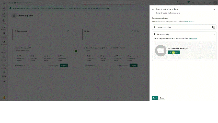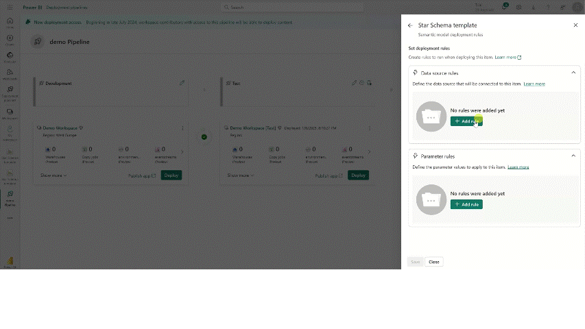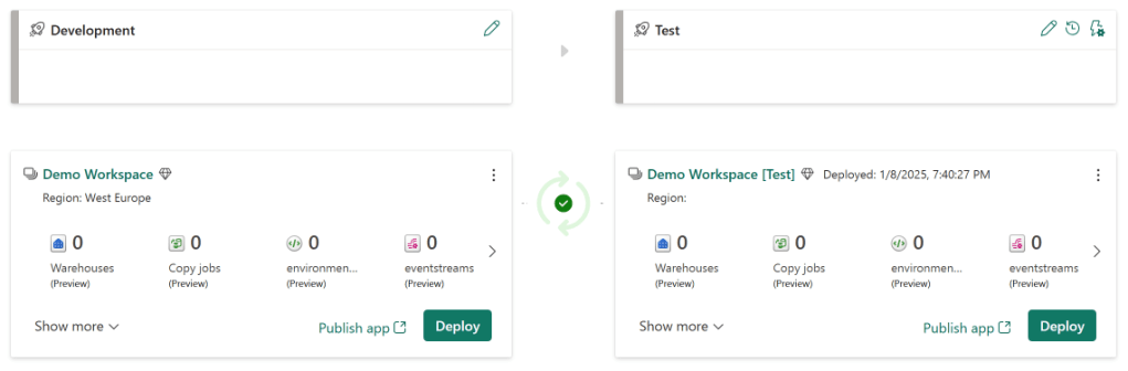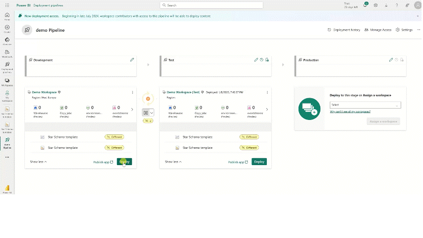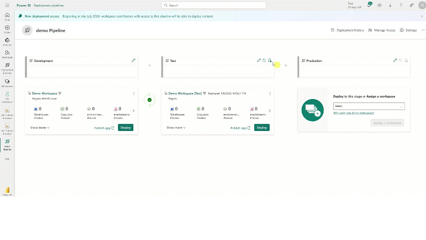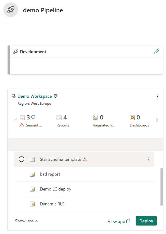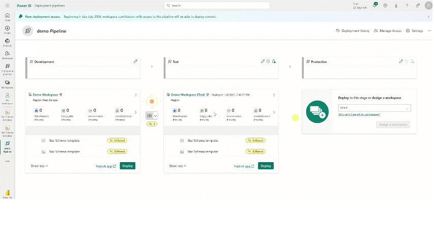 În plus, poate fi necesară ajustarea conexiunilor în acest proces, cum ar fi asocierea modelului semantic din Test la sursa de date de test și a celui din Live la sursa de date live. Gestionarea mai multor medii implică numeroase cerințe. Practic, devine indispensabil un instrument dedicat pentru a coordona publicarea (deployment) conținutului în multiple medii, iar aici intervine Deployment Pipeline.