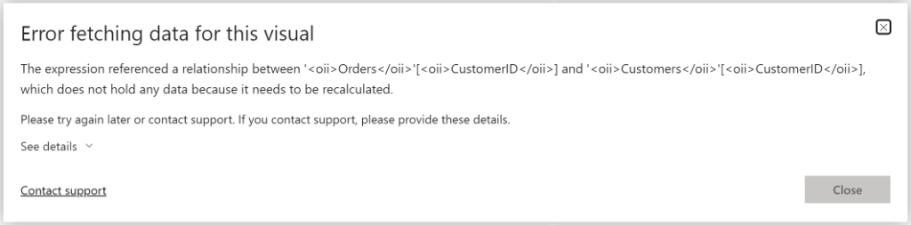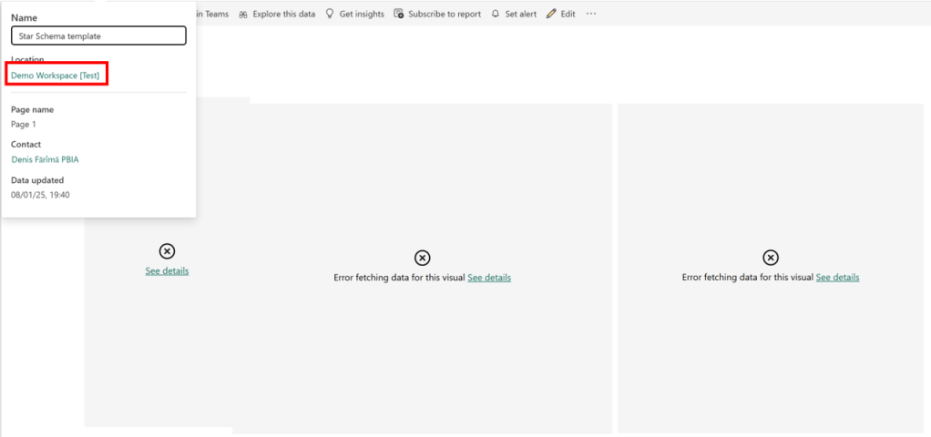 Aceste erori apar deoarece, în timpul implementării (deployment) în următorul mediu, sunt copiate doar metadatele, niciodată datele efective. Drept urmare, modelul semantic din mediul Test rămâne gol și nu poate afișa nicio vizualizare. Prin urmare, imediat după implementarea inițială, pasul următor obligatoriu este să declanșezi un refresh al modelului semantic proaspăt implementat.