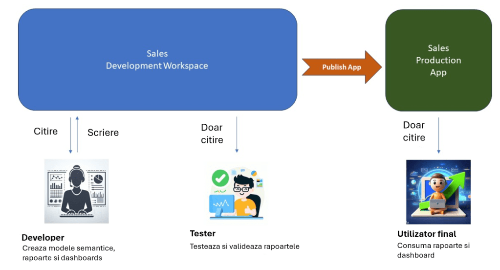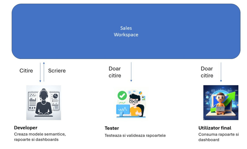 Înainte de a explora Deployment Pipelines, este esențial să înțelegem de ce sunt necesare mai multe medii într-o implementare Power BI. Pentru a ilustra acest aspect, să luăm un scenariu ipotetic: