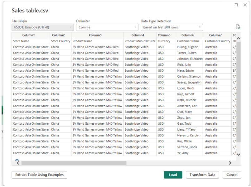- Încarcă sau Transformă Datele: După selectarea fișierului CSV, Power BI va afișa o previzualizare a datelor din fișier. Poți alege să încarci datele direct în Power BI apăsând pe butonul „Load”, sau poți apăsa pe butonul „Transform Data” pentru a deschide Power Query Editor și a aplica transformări înainte de a încărca datele.