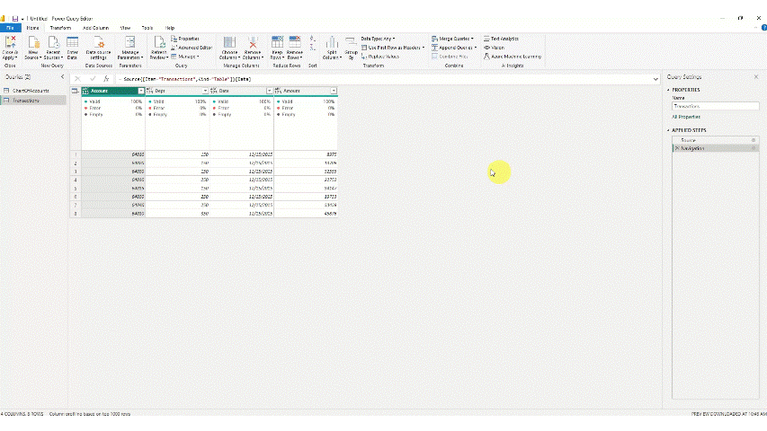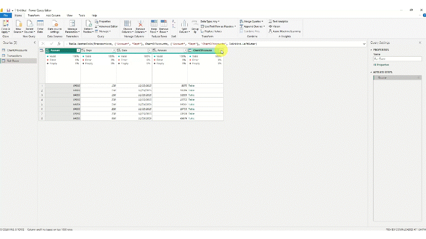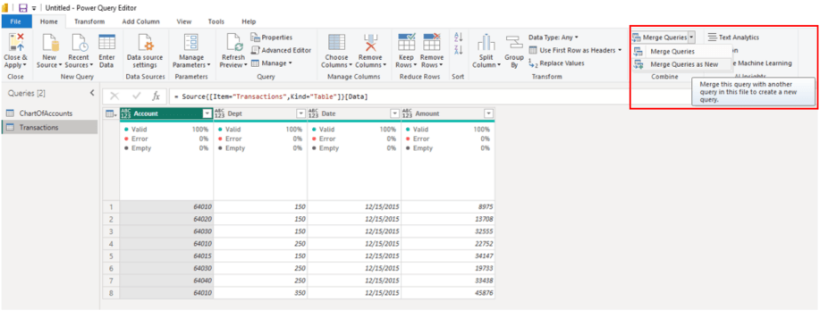 - În Power Query, cu tabelul Transactions (stânga) selectat, mergem la Home → Merge as New Query.