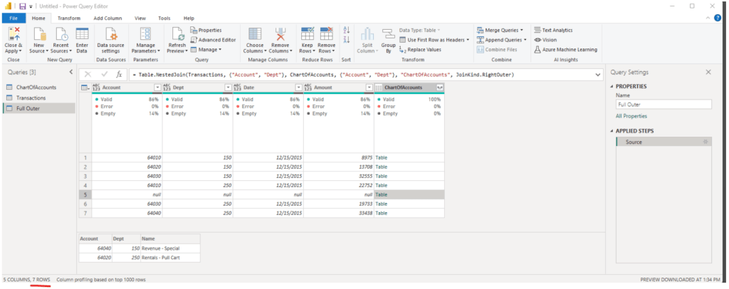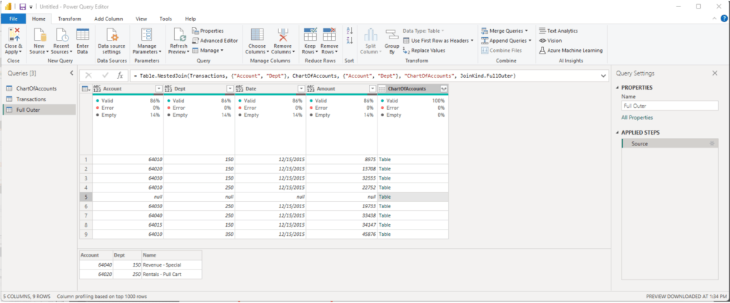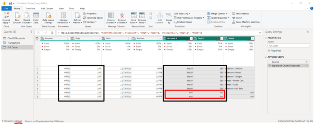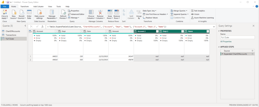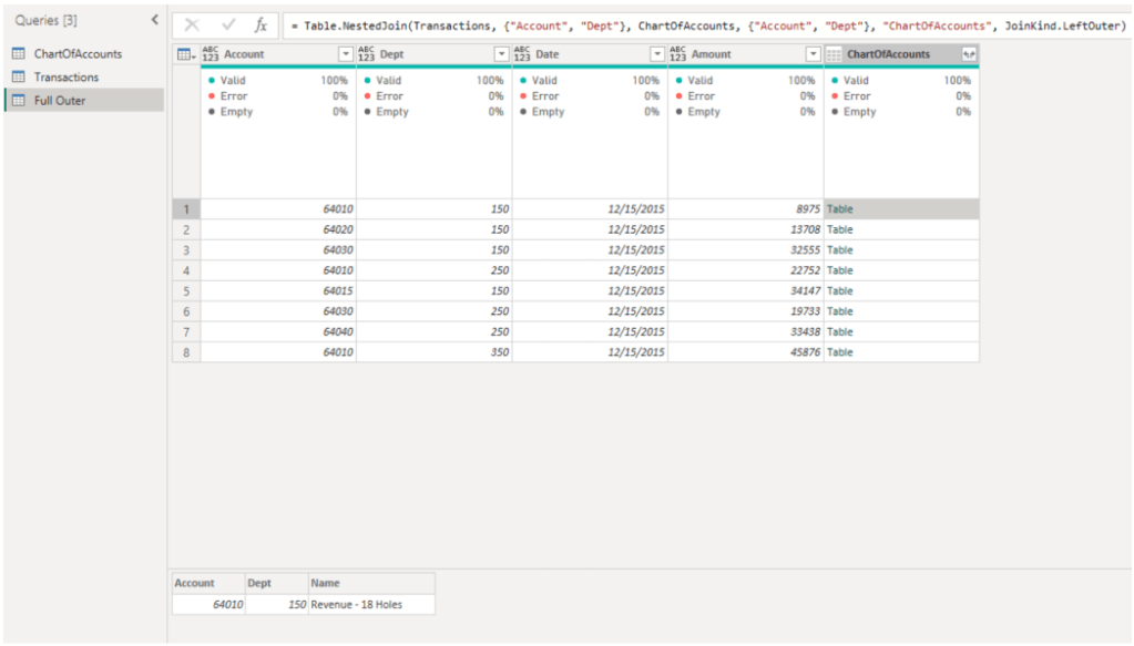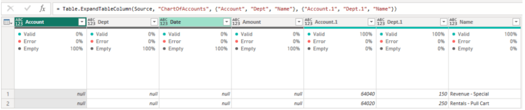 Îmbinarea externă stângă (Left Outer Join) a returnat toate rândurile din tabelul Transactions (stânga) și doar rândurile care se potrivesc din tabelul Charts of Accounts (dreapta).