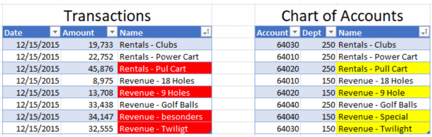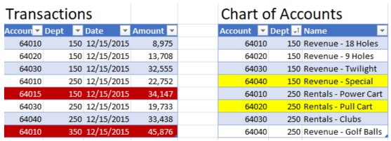 - În tabelul Chart of Accounts (dreapta), există două combinații de chei care nu se regăsesc în tabelul Transactions (stânga) – evidențiate cu galben.