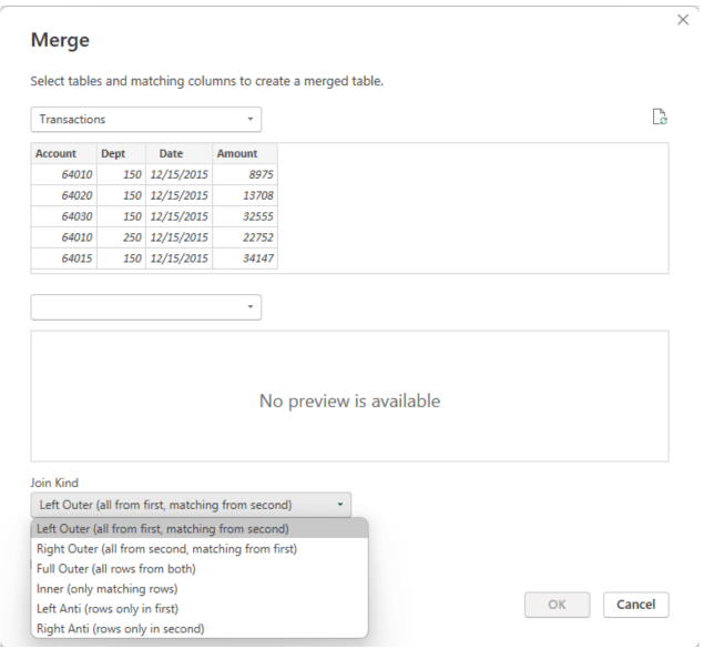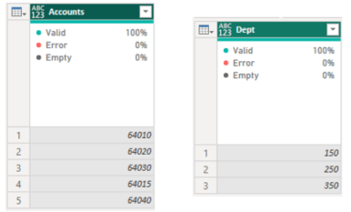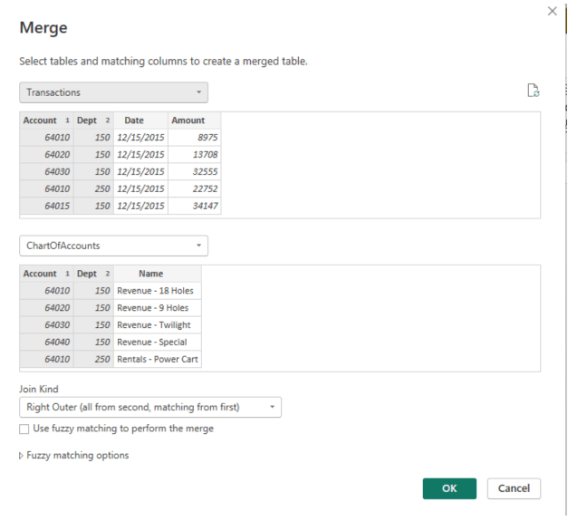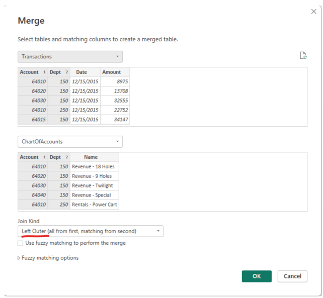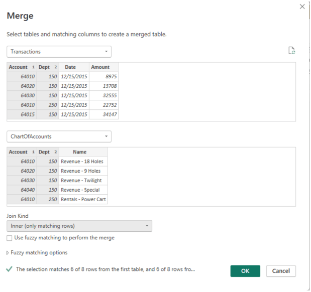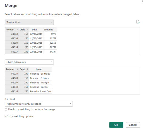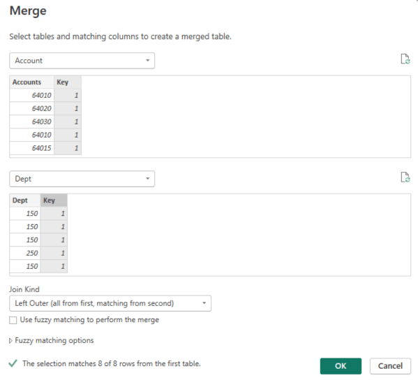 - Cheia de îmbinare este formată din două coloane: Account și Dept.