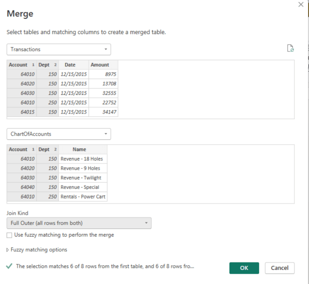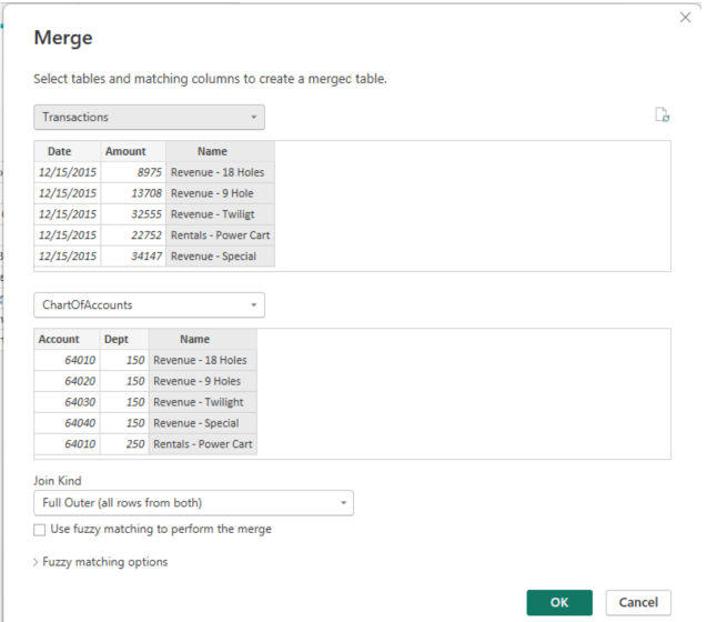 Power Query folosește algoritmul de similaritate Jaccard pentru a calcula asemănarea dintre perechi de instanțe. Identifică orice scor de similaritate de 80% sau mai mare ca fiind o potrivire. De exemplu, „Revenue – 9 Holes” este considerat suficient de similar cu „Revenue – 9 Hole”, în ciuda diferențelor minore, cum ar fi un caracter suplimentar sau utilizarea literelor mici. Potrivirea fuzzy ia în considerare și variații precum caractere transpuse (de exemplu, „friend” vs. „freind”) și discrepanțe minore de punctuație (de exemplu, „mrs” vs. „mrs.”). Cuvintele mai lungi, cu mai multe caractere similare, sunt mai susceptibile de a produce potriviri exacte atunci când se folosește Potrivirea Fuzzy.