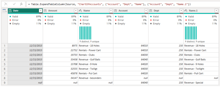 Combinațiile „64015 & 150” și „64010 & 350” sunt prezente în tabelul pre-expandat, iar există un rând nul (#5) unde combinațiile „64040 & 150” și „64020 & 150” sunt stocate într-un obiect tabel.