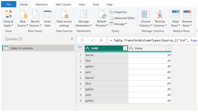Începem prin încărcarea datelor în Power BI și conectarea la un tabel. Vom folosi un exemplu cu vânzări exprimate în mai multe unități de măsură, care trebuie convertite în litri.