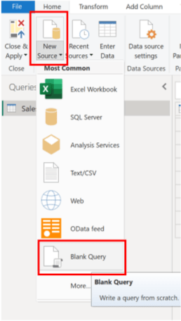 - În Power Query Editor, navigați la Home > New Source > Blank Query.